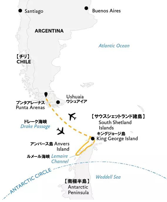 往復共、航空機を利用、船で南極半島周辺をクルーズ!チリのプンタアレーナスから南極にあるキングジョージ島まで3時間弱のフライトは、海上を航行する時間が短縮され南極のエッセンスだけが凝縮されたコースです。白い大陸のドラマティックな景観と完全なる美しさに酔いしれてしまうのはきっと想像以上でしょう。