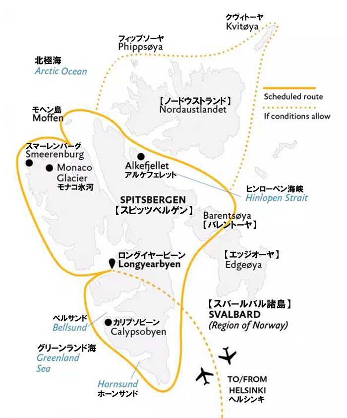 このコースは、スバールバル諸島の大きな島々を周遊するアドベンチャークルーズです。島々の奥深くまで入り込み、上陸する予定です。