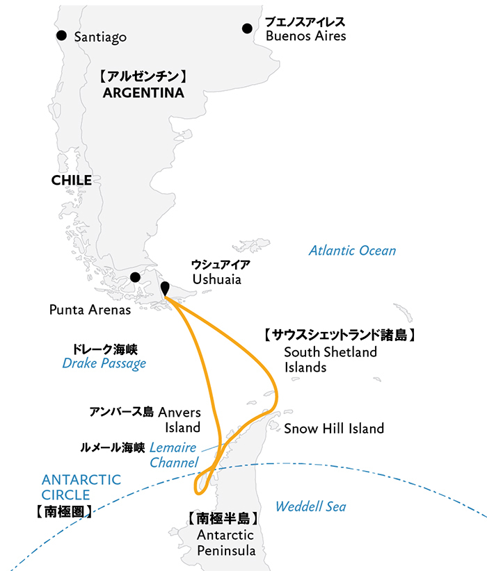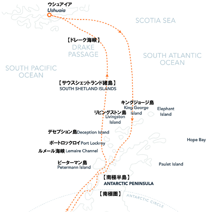 ※日程はすべて天候や氷海などの状況により異なります。また、日程通りすべてが完了するとは限りません。常に臨機応変さが必要です。南極半島とサウスシェットランド諸島では、200か所ほどの訪問地がありますので、上陸訪問地は事前に確定することができませんのでご了承ください。