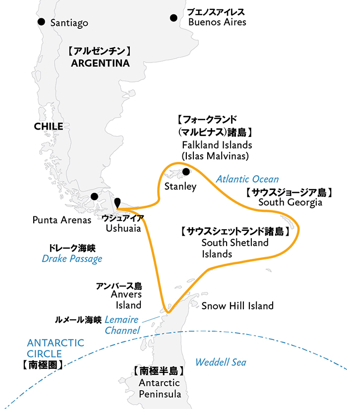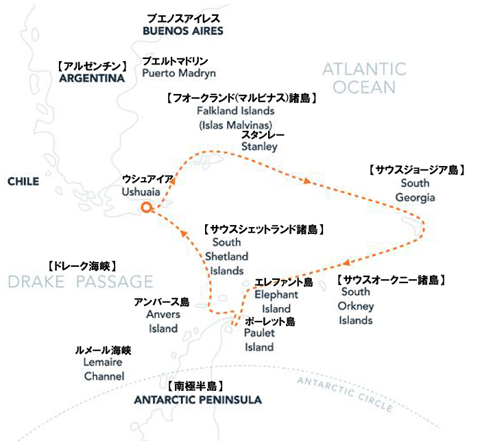 ※日程は、すべて天候や氷海などの状況により異なります。また、日程通りすべてが完了するとは限りません。常に臨機応変さが必要です。南極半島とサウスシェットランド諸島では、200か所ほどの訪問地がありますので、上陸訪問地は事前に確定することができませんのでご了承ください。