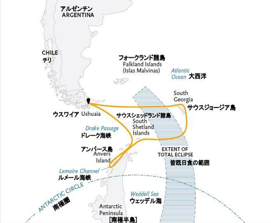 南極での皆既日食は限られた人のみが体験できる特別で不思議な瞬間です。しかも、それだけではありません。このクルーでは、南極圏で最も美しい場所への訪問が含まれています。南極大陸を直に触れる半極半島に加えてサウスジョージア島も訪問します。そこでは愛くるしいペンギン達、アザラシ、そして海鳥そして息をのむような山々、湾、そしてビーチに魅了されることでしょう。写真愛好家の聖地であり、エキゾチックな海鳥が生息する、自然豊かで文化的なフォークランド諸島のコースも用意しました。