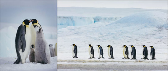 ここには約4,000組の繁殖ペアが生息し、ヒナを含めると最大1万羽もの皇帝ペンギンが観察できることもあります。雄も雌と同様に子育てを担い、−60℃の極寒や時速200kmの吹雪にも耐えるたくましい生き物です。その堂々とした姿から「ペンギン界の巨人」とも呼ばれています。