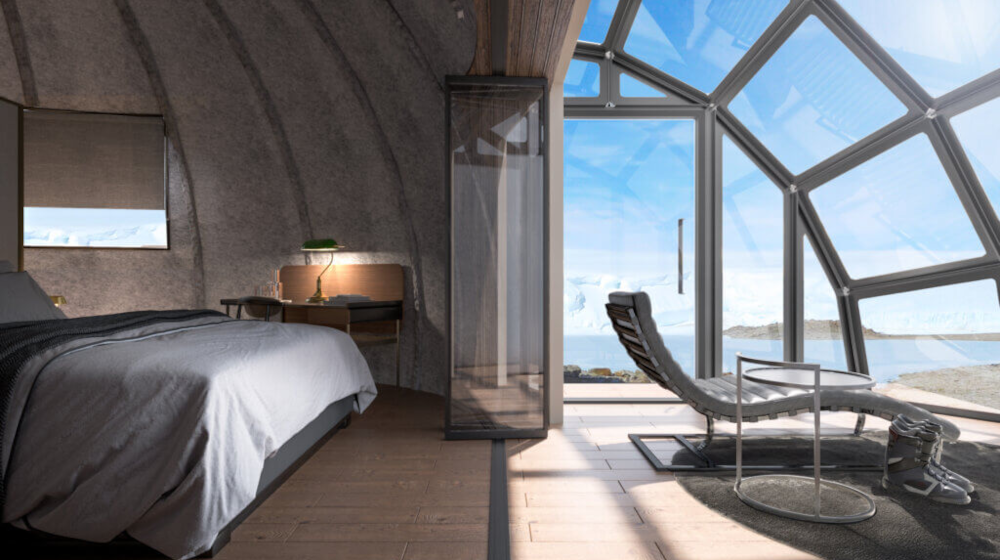 すべての宿泊ポッドにガラス張りの展望ルームを設け、氷の大地を包み込むような雄大な景色を心ゆくまで眺めることができます。ベッドに横たわりながら、氷と光が織りなす南極の静寂を感じてください。